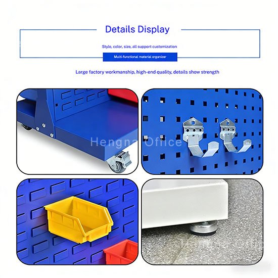 This product belongs to the “HNRK” series of mobile material organization racks, offering an efficient space management solution specifically engineered for industrial environments. Its unique double-sided slatted panel structure, combined with adjustable hooks and multi-color storage bins, enables visual organization and storage of tools, parts, and consumables.
